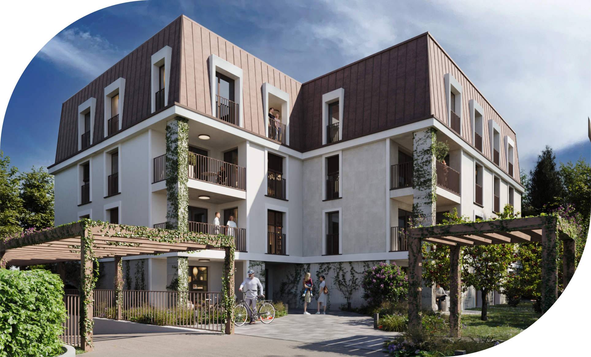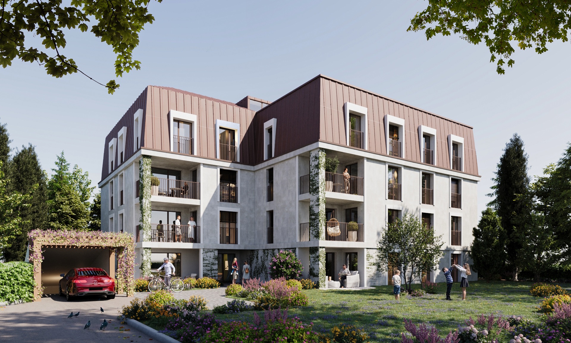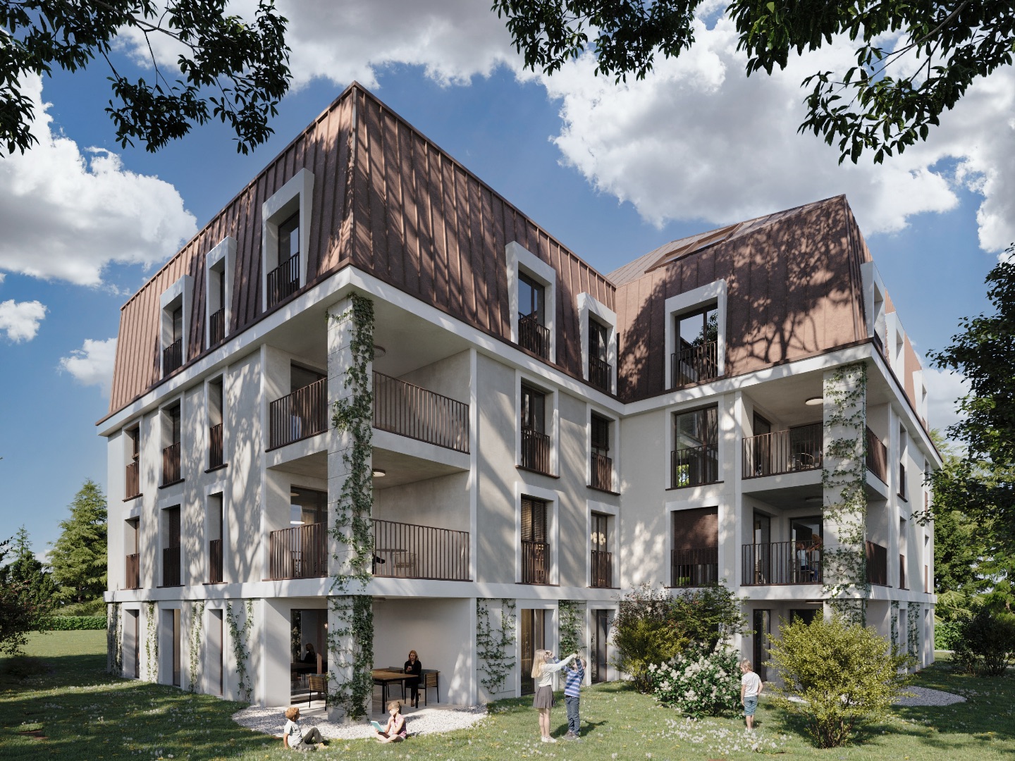 La résidence s’élève sur quatre niveaux et propose une diversité de typologies allant du 1.5 pièces compact et fonctionnel au 4.5 pièces spacieux et familial, avec en attique un appartement d’exception doté d’une terrasse de plus de 30 m².